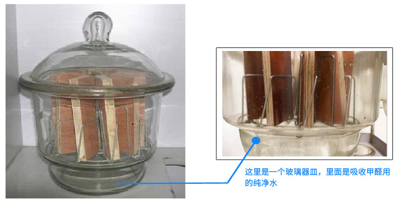 你看看上面那張表,表中的《人造板及其制品用甲醛清除劑清除能力的測試方法》,這個方法是檢測人造板甲醛釋放量方法,專業上稱之為“干燥器法”。就是把10塊切割成15cm×5cm的人造板,放到這個10升的玻璃容器里,密閉24小時。24小時中,人造板不停地釋放甲醛,在玻璃容器的底部,放著一個盛著純凈水的玻璃器皿,人造板釋放出來的甲醛被吸收在水中,然后檢測水中的甲醛,所得數值就是人造板甲醛釋放量。